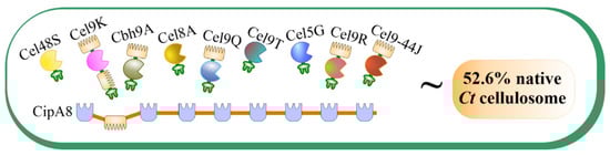 Full synthetic cellulosome complex containing 25% of Cel48S, 12.5% each of Cel9K, Cbh9A, Cel8A, Cel9Q, Cel9T, and 4.2% each of Cel5G, Cel9R, and Cel9-44J (stoichiometric assembly ratio, % mol), whereas the stoichiometric binding capacity equals 1:8 (CipA:single enzyme). Abbreviations in the Figure 1: Ct, C. thermocellum.