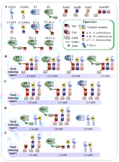 - Stern, J.; Kahn, A.; Vazana, Y.; Shamshoum, M.; Moraïs, S.; Lamed, R.; Bayer, E. Significance of Relative Position of Cellulases in Designer Cellulosomes for Optimized Cellulolysis. PLoS ONE 2015, 10, e0127326. [Google Scholar] [CrossRef]