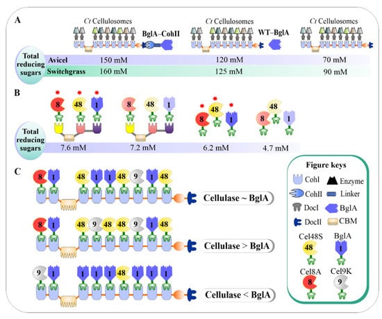 Previous studies noticed the inhibitory effect of glucose [] and cellobiose [,] on cellulosomes. Therefore, eliminating this feedback inhibition enables an enhanced biomass conversion []. The activity of β-glucosidase BglA was found to be too low in WT C. thermocellum strains [], and due to the adsorption of cellulosomes in cellulose matrix, only a small fraction of BglA is available to cellulosomes []. To address this problem, Gefen et al. (2012) [] fused a β-glucosidase BglA protein with an unoccupied CohII and integrated this chimeric BglA–CohII complex into the purified C. thermocellum cellulosome. On Avicel and pretreated switchgrass, the cellulosomes, in combination with the resultant chimeric BglA–CohII complex, showed the highest saccharolytic efficiency, followed by the cellulosomes plus free WT BglA, and the C. thermocellum cellulosomes alone (Figure 4A). The enzyme activity was assayed in 50 mM citrate buffer (pH 6.0) and 15 mM CaCl2 with 0.475 mg/mL cellulosome and 12.5% (w/v) Avicel or 4.2% (w/v) pretreated switchgrass as the substrate. The β-glucosidase concentration for the assay was 0.75 µM for WT BglA or BglA-CohII in an equivalent specific activity. After the first reaction, the resultant supernatants were transferred into a new reaction mixture with 0.5 μM WT BglA in 50 mM citrate buffer (pH 6.0) and 15 mM CaCl2. The reaction was incubated at 60 °C for 3 h to convert all cellobiose into glucose. Overall, the study of Gefen and coworkers [] suggested that spatial proximity of β-glucosidase to cellulosomes is a crucial parameter that influences saccharification efficiency. To corroborate the finding of Gefen et al., Li et al. [] employed a thermotolerant BGL from Caldicellulosiruptor sp. F32 (CaBglA) to fuse with the CohII or with the CBM3a from C. thermocellum to generate CaBglA–CohII and CaBglA–CBM3a, respectively. On Avicel, the complexations of Ct cellulosomes and CaBglA–CohII via CohII–DocII interaction exhibited the highest activity, then the mixed proteins of cellulosomes with CaBglA–CBM3a, the mixture of cellulosomes with free CaBglA, and the cellulosomes alone. In addition, the glucose production also followed this order, indicating the greatest conversion rate of CaBglA in the closeness to cellulosomes. In contrast, the accumulation of cellobiose was the greatest in the sole cellulosomes treatment, suggesting an important role of Bgl enzyme in cellulose degradation.