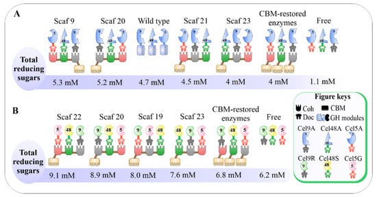 The position of catalytic subunits in the Scaf structure may govern the catalytic activity of DCs. In a study by Stern and coworkers [], three recombinant T. fusca enzymes such as the processive EG Cel9A, EG Cel5A, and exoglucanase Cel48A were recombinantly generated and converted into the cellulosomal mode for DC constructions. Besides, ten chimeric Scaf(s), namely Scaf4, Scaf5, Scaf6, Scaf9, Scaf18, Scaf19, Scaf20, Scaf21, Scaf22, and Scaf23, with different designated orders of enzymes and CBMs were also produced. The enzymatic assay was carried out in 50 mM acetate buffer (pH 5.0), 12 mM CaCl2, 2 mM EDTA, 10% (w/v) Avicel, incubated at 50 °C for 24–72 h with shaking. The two optimal trivalent Scaf configurations Scaf20 (i.e., ScafABT:a–Cel9A/b–Cel48A/Cel5A–t) with the T. fusca processive EG Cel9A and the C. thermocellum carbohydrate-binding module (CBM3a) located at the left side of Scaf20 structure, and Scaf9 (i.e., ScafTBA:Cel5A–t/b–Cel48A/a–Cel9A) with the T. fusca Cel9A and the C. thermocellum CBM3a positioned at the right side of its structure demonstrated the maximum catalytic activity on Avicel (Figure 5A). Similar results were observed when the T. fusca Cel9A, Cel5A, and Cel48A were substituted with their orthologues C. thermocellum Cel9R, Cel5G, and Cel48S, respectively (Figure 5B). Based on their hydrolytic efficiencies, the suggestion for future artificial cellulosomes design is that the processive EG should not be placed in the middle of the trivalent chimeric Scaf because the processive EG functions by cutting β-1,4-glycosidic bonds in the interior of the cellulose chain, followed by a processive cleavage of the even-numbered short oligosaccharides [], its middle position within the trivalent Scaf likely restricted its movement along the substrate. In contrast, the processive EG should be located close to a CBM in the Scaf to properly fulfill its catalytic function. The third conclusion that can be drawn is that two enzymes with parallel characteristics (i.e., processive Cel9A and Cel5A from T. fusca or processive Cel9R and Cel5G from C. thermocellum) should not be placed in proximity with each other since this might lead to an unnecessary functional competition between them.