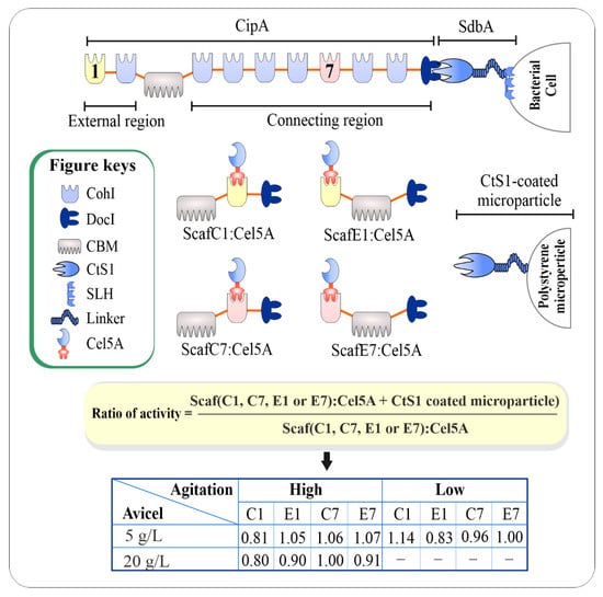 (From the top) The CohI located in the external and connecting regions on the CipA scaffoldin protein were used to construct mini-Scaf. Mechanically unstable Coh1 was positioned between CBM3a and DocII (ScafC1) or outside of the CBM3a (ScafE1), and mechanically stable Coh7 was placed between CBM3a and DocII (ScafC7) or outside of the CBM3a (ScafE7). The complexations of ScafC1:Cel5A, ScafE1:Cel5A, ScafC7:Cel5A, and ScafE7:Cel5A was bound to CtS1-coated microparticle for biomimetic cellulosome construction.