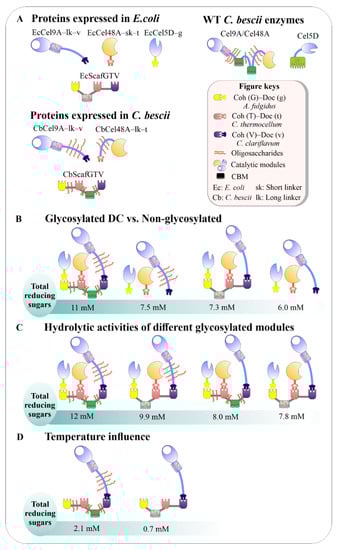 - Kahn, A.; Moraïs, S.; Chung, D.; Sarai, N.; Hengge, N.; Kahn, A.; Himmel, M.; Bayer, E.; Bomble, Y. Glycosylation of Hyperthermostable Designer Cellulosome Components Yields Enhanced Stability and Cellulose Hydrolysis. FEBS J. 2020, 287, 4370–4388. [Google Scholar] [CrossRef]