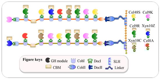 - Caspi, J.; Barak, Y.; Haimovitz, R.; Irwin, D.; Lamed, R.; Wilson, D.; Bayer, E. Effect of Linker Length and Dockerin Position on Conversion of a Thermobifida Fusca Endoglucanase to the Cellulosomal Mode. Appl. Environ. Microbiol. 2009, 75, 7335–7342. [Google Scholar] [CrossRef][Green Version]