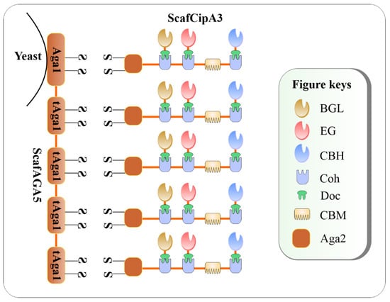 A double-layered cellulosome was synthesized in a study by Tang et al. [] where an artificial ScafAGA3 bearing the repeated N-terminus of Aga1p (tAga1p) was displayed on the cell surface of S. cerevisiae through the Aga1p C-terminal domain. The ScafAGA3 was used as an anchoring protein via Aga1p-Aga2p linkage and the ScafCipA3 functioned as the primary Scaf for cellulase assembly (Figure 10). The ScafCipA3, which contained three CohI(s) from C. thermocellum on its structure, carried three cellulases from divergent microbes via CohI–DocI interaction. For the conversion of free cellulases into cellulosomal mode, a BGL from Saccharomycopsis fibuligera, a CBH from Talaromyces emersonii, and an EG CelA from C. thermocellum were fused with the traditional C. thermocellum DocI(s). The novel disulfide bonds showed higher display efficiency of the ScafAGA3 on the cell surface in comparison with that of the conventional CtScafCipA3. The result demonstrates that the covalent disulfide bonds of tAga1p–Aga2 appeared to outperform the non-covalent bonds of the conventional CohI–DocI pair in cellulase assemblage. For enzyme activity measurement, the enzymes were mixed with 5 mM p-nitrophenyl-β-D-cellobiose (pNPC) or carboxymethylcellulose sodium salt (CMC-Na) as the substrates in 50 mM citrate buffer (pH 5.0) at 50 °C for 30 min for CBH and EG measurements, respectively. The resultant engineered S. cerevisiae carrying the double-layered cellulosome ScafAGA5–ScafCipA3:CBH1/CelA/BGLA produced 1.52 g/L ethanol on 1% (w/v) PASC. In summary, despite many efforts to create the CBP S. cerevisiae, the bioethanol produced by these engineered strains have been still modest due mainly to the lower efficiency of the surface-displayed cellulosomes. Some catalytic proteins assembled onto the DCs did not have sufficient ability to digest high substrate concentrations to supply an abundant fermentable sugar source for the CBP S. cerevisiae.