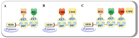 The novel ultra-high-affinity IM7–CL7 protein pair (KD~10−14–10−17 M) was used for cellulase assembly onto P. pastoris cell surface. (A) The engineered P. pastoris with one BGL and one EG enzyme on its surface. (B) The engineered P. pastoris with one CBH and one CBM on its surface. (C) The engineered P. pastoris with one CBH, one EG, one CBH, and one CBM on its surface.