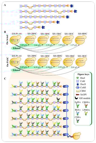 In C. thermocellum, aside from bearing CohI(s) on its backbone, the CipA has a DocII subunit that interacts with the CohII on the bacterial cell surface to mediate the attachment of the entire Scaf and cellulolytic enzymes complex to the C. thermocellum cell surface. The anchoring outer layer protein B (OlpB) has seven CohII(s) subunits, so it can theoretically concurrently carry up to 63 saccharolytic enzymes. Generally, the incorporation of more catalytic enzymes onto the primary Scaf results in higher synergy for substrate decomposition []. The thermotolerant K. marxianus has several advantages (e.g., a wide range of sugars assimilation, thermo, salinity, and toxin tolerance, a wide range of pH, high ethanol yield at elevated temperature) for industrial applications [,], and therefore it could be used as an alternative to S. cerevisiae in specific conditions. Recently, the anchoring protein OlpB was successfully introduced and expressed in K. marxianus cells by Anandharaj and coworkers []. In this study, lytic polysaccharide monooxygenases (LPMO), the copper-dependent enzymes, which can efficiently solubilize crystalline cellulose by cleaving polysaccharides through an oxidative mechanism, was converted to the cellulosomal mode for constructing DC. These enzymes were brought to light in the last decade and some previous studies that integrated LPMO enzyme into cellulosome complex were performed by Arfi et al. (2014) [] and Liang et al. []. Apart from the LPMO from Thermoascus aurantiacus (TaLPMO) and its electron donor cellobiose dehydrogenase from Myceliophthora thermophila (MtCDH), an EG from T. reesei (TrEgIII), a synthetic CBH (CBHII), and a BGL from Neocallimastix patriciarum (NpaBGS) were fused with a DocI of C. thermocellum to create DocI-fused enzyme subunits, namely TrEgIII–t, CBHII–t, NpaBGS–t, TaLPMO–t, and MtCDH–t, respectively (Figure 12). In addition, a cell-surface protein glycosylphosphatidylonositol (GPI) from S. cerevisiae (ScGPI) was used to facilitate the anchoring of the artificial cellulosome to the K. marxianus cell surface because the anchoring domain of C. thermocellum is not suitable for eukaryotic hosts. The supernatants of red fluorescent protein (RFP)-fused DocT (RFP–DocT), OlpB–ScGPI, and CipA1B9C were mixed to form the entire cellulosome complex, namely OlpB–ScGPI:CipA1B9C:RFP–DocT, and their assembly was confirmed using an epifluorescence microscopy. The hydrolytic activity of cellulosome on 1% (w/v) Avicel was quantified by mixing the concentrated supernatants of the YP culture broth with Avicel and incubated at 40 °C for 6 h. On the model micro-crystalline cellulose Avicel, the amounts of sugar release were significantly influenced by the number of CohI and the number of CBMs, whereas the effect of these components was less pronounced on amorphous cellulose phosphoric acid swollen cellulose (PASC) hydrolysis (Figure 12A,B). The results confirmed the decisive roles of the scaffoldin protein CipA in cellulose solubilization rate as elucidated in a previous study by Olson et al. []. To the best of our knowledge, this is the first time an assembly of 63 saccharolytic cellulosomal enzymes from different species was engineered and expressed on a heterologous host’s surface, enabling a greater biomass degradation rate for future consolidated bioprocessing (CBP) microorganisms (Figure 12C).