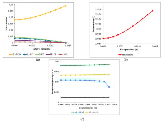 Figure 3 shows the molar fractions of components and the temperature and reaction rate profiles in the catalyst under the inlet conditions of the reactor. As shown in Figure 3a, the molar fraction of the reactant, 2,3-BDO, exhibits a decreasing trend towards the center of the catalyst pellet as a result of a pore diffusion effect. Otherwise, the molar fractions of the components except for 2,3-BDO are higher at the center of the pellet than on the pellet surface because reactions (r1–r4) take place in the pellet. In the case of the temperature profile shown in Figure 3b, the temperature decreases slightly toward the center of the catalyst pellet owing to the endothermic nature of the reactions. The temperature difference between the center and the surface of the catalyst is very little and does not significantly affect the performance of the reactor. Therefore, we assumed that the temperature in the catalysis is constant for the simulation model used in Section 5 and Section 6. As represented in Figure 3c, the reaction rate, r2, increases toward the center of the pellet, especially near the surface of the catalyst, because of 3B2OL, the reactant of r2, produced from 2,3-BDO by r1. On the other hand, other reactions except for r2 decrease slightly toward the center of the pellet because of the pore diffusion effects of the reactant, 2,3-BDO.