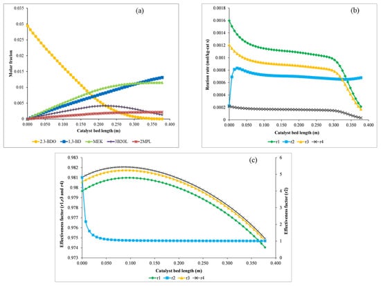 Figure 4 shows the molar fractions of components, reaction rates, and effectiveness factor profiles along the length of the catalyst bed. The molar fractions of the components are shown in Figure 4a. The reactant, 2,3-BDO, decreases in concentration linearly by 0.21 m from the inlet of the catalyst bed, the rate of decrease drops after 0.21 m, and the reactant is almost consumed at the outlet of the reactor. MEK and 2MPL, which are produced by r3 and r4, increase linearly by 0.21 m from the inlet of the catalyst bed, and the rate of increase declines after 0.21 m. On the other hand, the concentration of 3B2OL, made by r1, increases by 0.23 m at the inlet of the reactor and decreases towards the end of the reactor. The concentration of 1,3-BD, produced by r2, increases linearly towards the outlet of the reactor owing to the 3B2OL produced by r1. Figure 4b shows the profiles of reaction rates at the surface of the catalyst along the length of the catalyst bed. The reaction rates (r1, r3, and r4) show a similar pattern, albeit they may be greater or less. After 0.29 m, the reaction rates decrease sharply because most of the reactant, 2,3-BDO, is consumed by that point. On the other hand, the reaction rate (r2) increases sharply near the entrance of the reactor, decreases a little bit, then is constant until it exits the catalyst bed thanks to the 3B2OL produced by r1, as shown in Figure 4a. The profiles of the effectiveness factors are represented in Figure 4c. The effectiveness factors (η1, η3, and η4) increase a little bit by 0.7 m from the inlet of the catalyst bed and decrease slightly towards the outlet of the reactor, but their values are very close to 1, meaning that mass transfer is fast compared to kinetics. Otherwise, the effectiveness factor (η2) is about 4.8 at the inlet of the reactor because the reaction rate, r2, increases toward the center of the pellet owing to 3B2OL, the reactant of r2, as shown in Figure 4b. η2 decreases sharply by 0.05 m because r2 at the surface of the catalyst increases with the intermediate product 3B2OL along the length of the catalyst bed. η2 remains approximately 1, like the other effectiveness factors, after 0.05 m.
