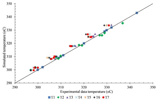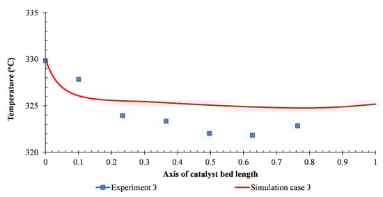 The simulated temperature profile and the third experimental temperature data were presented in Figure 5. The scattered points are the temperatures measured by the sensors, while the solid lines are the fluid temperature profiles from the simulation. The temperature of the actual reactor gradually decreases from 330 °C to 323 °C which is obtained from sensors T1 to T7, respectively. At the inlet of the catalyst bed, the concentration of 2,3-BDO was high, and the reaction occurred rapidly, while the temperature dropped. Due to the reduction of the reactant 2,3-BDO, the reaction was slower, and there was no reaction after 0.3 m. The variation in temperature profile was more significant where the inlet temperature was high. This variation trend can be explained with the reaction orders (n1, n3, n4: 0.0187 and n2: 0.146) that are close to 0, meaning that reaction rates mainly depend on the temperature. The temperature comparison of the rest of the cases can be seen in Figure 6. There was a great similarity between simulation results and experimental data in the majority of the cases. The temperature profile of all cases was found to decrease noticeably in about 30% of the height from the top of the catalyst bed, then slowly decrease till 70% of the height and imperceptibly for the rest of the bed.