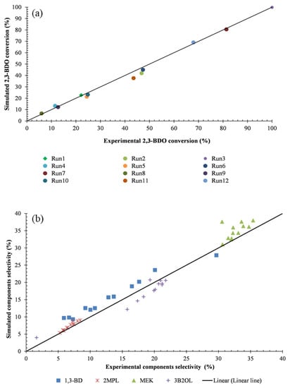 The selectivity of 1,3-BD, 2MPL, 2-Butanone (MEK), and 3-Buten-2-ol were reported in Figure 7b. In the majority of the cases, the selectivity of all components in experiments is similar to the calculation result. The differences of selectivity of 1,3 butadiene and MEK, the final products of 2,3-BDO dehydration, are less than 3.4% and 4%, respectively. The MEK selectivity was higher and more stable compared to1,3-BD (30.6–35.4% compared to 6.9–29.7%, respectively). The reason is that the activation energy of the reaction routes (Equations (1) and (2)) of 1,3-BD is higher than that of the reaction route (Equation (3)) of MEK, explaining the sharp changing rate of 1,3-BD selectivity compared to the MEK selectivity (see Table S2 in Supplementary Material). The validation result demonstrates that the reactor model can be used to analyze and predict reactor performance.