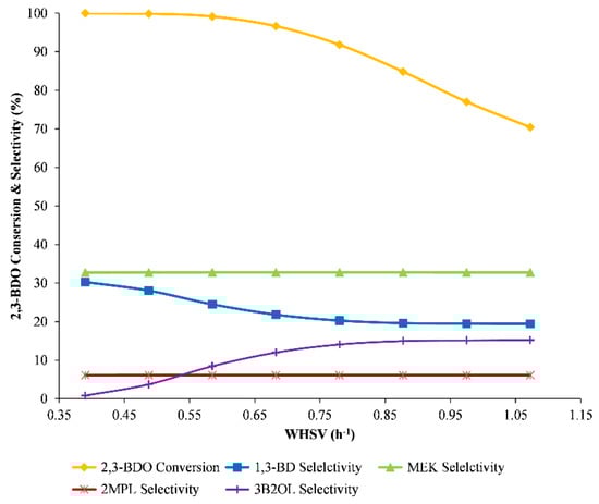 As an obtained result from experimental data, the high value of WHSV (2 h−1) reflects the low efficiency of the reaction. Thus, the range of WHSV from 0.39 to 1.07 h−1 was considered to investigate the effect of WHSV. The reactor model operating conditions were maintained at 330 °C and 1 bar. The simulation result is shown in Figure 8. With the increase of WHSV, the 2,3-BDO conversion rate decreased from approximately 100% to 70%. The resulting line goes down significantly from the point 0.68 of WHSV. This indicated that although increasing WHSV raises the outlet product flow rate, the WHSV condition should be lower than 0.65 h−1.