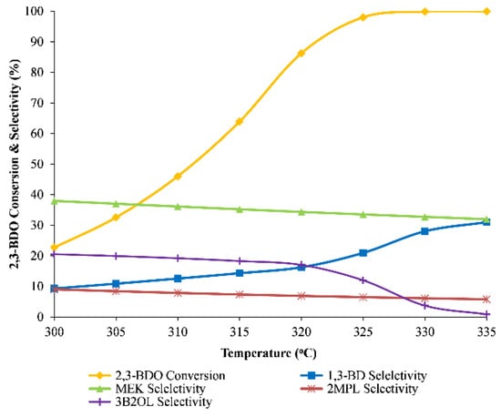 The feed stream temperature at the beginning of the catalyst bed was investigated while the WHSV is kept at 0.5 h−1. Figure 9 shows that almost complete conversion of 2,3-BDO is achieved when the temperature is higher than 330 °C. The overall 2,3-BDO conversion rises from 23% to 98% in the range 300–325 °C and attains 99.9% at 335 °C. Through the increase of temperature, the 1,3-BD selectivity increases considerably from 9.3% to 31%, while MEK selectivity reduces slightly from 37% to 32%. This can be explained by the activation differences of the related reaction mentioned in Section 5.2. However, the concentration of impurities increased sharply when the inlet temperature is higher than 340 °C [21]. The result shows that the reactor should be operated in the temperature range of 330–340 °C.