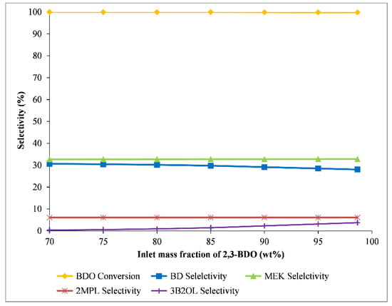 Due to external factors affecting plant operation, the feed composition is not stable at all operating times. Thus, the mass fraction of BDO was varied from 98.6% to 70% to check the effect of feed composition. The rest of the feed composition is H2O. The operating conditions (inlet temperature, 330 °C, and WHSV, 0.5 h−1) were chosen for the sensitivity analysis. The results are presented in Figure 10. Although the inlet BDO decreased to approximately 30%, the MEK selectivity was stable at around 32.7%. The 1,3-BD selectivity increased slightly from 28% to 30.6%, while the 3B2OL selectivity reduced from 3.7% to 0.3%. The results suggest that the high selectivity of the desired product (MEK and 1,3-BD) could be achieved with low purity of 2,3-BDO feedstock. This means that the high concentration 2,3-BOD is not necessary for the dehydration reaction. The concentration is determined by the purification process of a Biofermentation process to produce 2,3-BDO [11]. This concentration issue would lead to a trade-off relationship between production costs and 2,3-BOD concentration. The trade-off relationship should be studied as part of the whole process, including Biofermentation and 2,3-BDO dehydration processes.