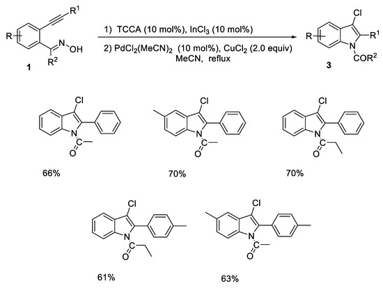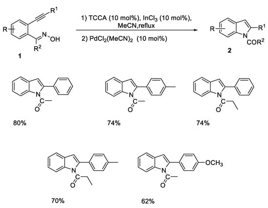 One of the attractive strategies for constructing complex molecules is a tandem reaction [63,64,65,66,67,68,69,70,71]; by this methodology, N-heterocycles are formed by utilizing 2-alkynyl benzaldoxime in the laboratory for synthesizing compounds resembling natural compounds [72,73,74,75,76,77,78,79,80,81,82,83]. Moreover, the use of ketoxime in amide production for the Beckmann rearrangement has shown to be a successful and extensively used method [84,85]. In 2010, Qiu and colleagues used a two-step catalytic system for the synthesis of N-substituted indole (2). They utilized 1-(2-alkynylphenyl)ketoxime (1) as the starting substrate in the tandem reaction using (NCCl)3 in the presence of InCl3 co-catalysts. Their action involved Beckmann rearrangement and subsequent intramolecular cyclization of (1) to acquire the desired N-substituted indoles which are fundamental structures in both the therapeutic agents and natural products (Scheme 1). This one-pot multi-catalytic strategy was effective for 1-(2-alkynylphenyl)ketoximes (1) having either electron-donating or electron-withdrawing substituents on the aromatic ring.