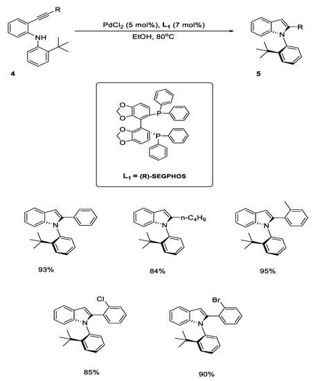 Atropisomeric compounds having a chiral N-C axis gained excessive attention as innovative chiral molecules over recent years [87,88,89,90,91,92,93,94,95,96,97,98,99,100,101,102,103,104,105]. They are also considered important in the field of advanced organic enantioselective catalytic preparation of the innovative compounds having a chiral Nitrogen-Carbon axis [106,107,108,109,110,111,112,113,114,115,116,117,118,119,120,121,122,123,124,125,126]. In 2010, Ototake and co-workers stated that the reaction utilizing basic reagents or transition-metal catalysts has been reported as an effective method for constructing indole nuclei [107,127,128,129,130]. They firstly synthesized optically active atropisomeric compounds, N-(o-tert-butyl phenyl)indole derivatives (5) by palladium-catalyzed asymmetric 5-endo-hydroamino cyclization of the achiral N-(o-tert-butylphenyl)-2-alkynylanilines (4), affording approximately 83% (ee) product (Scheme 3) [131].
