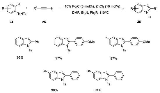 The 2-substituted indoles were synthesized in the presence of economic ZiCl2 that acted as a co-catalyst instead of CuI in the Pd-catalyzed Sonogashira cross-coupling/cyclization. The reactants used in this reaction were terminal alkynes and N-tosyl-2-iodoanilines. In this reaction, terminal alkynes (25) were heated with 2-iodoanilines (24) using 10% Pd/C, Et3N, PPh3, and moist ZnCl2 at 110 °C in dry DMF for 3 h to afford N-protected indoles (26) in higher yields (Scheme 10). At room temperature, the reaction was unable to yield any desired product; while at 110 °C, the desired indole was obtained in a minor quantity together with di-yne produced predominantly by homocoupling of the alkyne. However, after utilizing moist ZnCl2, the only product that was formed was the desired indole without yielding any by-product of homocoupling [155]. Furthermore, they synthesized N-unsubstituted indoles by employing N-formamide-2-iodoanilines rather than N-tosyl-2-iodoanilines. For this reaction, N-(2-iodoaryl)formamides (27) were treated with phenylacetylene (28) (terminal alkynes) in Pd-catalyzed cross-coupling/cyclization, yielding corresponding indoles (29) via an intramolecular cascade C–C/C–N bond generation (Scheme 11). The formamides having electron-donating groups or poor electron-withdrawing groups afforded the desired product in less than 1.5 h in a high yield. In the case of formamides bearing strong electron-withdrawing substituents, a long reaction time was required with the decrease in the yield of the desired product. The reaction was performed by the following sequential steps: Sonogashira cross-coupling, followed by the formation of the intramolecular C–N bond using the exact catalytic system, affording the intermediate substance (30), after which hydrolysis afforded the indole derivatives (29) (Scheme 11) [156].