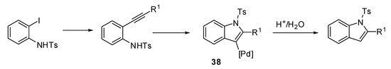 In 2017, Bruneau and co-workers synthesized indoles (37) by employing a heterogeneous catalytic system while reacting o-iodoanilines (35) with terminal alkynes (36) (Scheme 13). The catalytic system was composed of nanoparticles of palladium supported on (Pd0 –AmP–MCF), the siliceous meso-cellular foam. The presence of water even in a small amount affected the transformation. Moreover, the water increased the yield of indole by accelerating the hydrolysis of vinyl Pd-intermediate (38), which was involved in this annulation process (Scheme 14). Under mild reaction conditions, this catalytic protocol enabled good to excellent yields of the desired products without adding any ligand [158].