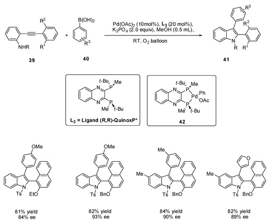 In 2020, He and colleagues synthesized highly enantioselective 2,3-disubstituted indoles (ee) (41) via a Pd-catalyzed Cacchi reaction between N-aryl(alkyl)sulfonyl-2-alkynylanilides (39) and aryl boronic acid (40). The optimized reaction conditions for the reaction involved Pd(OAc)2 in a catalytic amount, ligand (R,R)-QuinoxP*(L3), and the base K3PO4 in the presence of solvent MeOH under an O2 atmosphere (Scheme 15). The experimental studies suggested that the trans-metallation occurred before the amino-palladation in the aryl annulation process. The ligand (L3) and PdPh(OAc) complex (42) was the vital intermediate in the synthesis. The reaction was remarkably influenced by the size as well as the nature of –OR substituent on the naphthyl moiety, and the presence of -OBn afforded the best results. Aryl boronic acid having electron-donating or electron-withdrawing substituents underwent the reaction smoothly, affording a good to high yield. This reaction also tolerated the presence of many groups as well as heterocyclic substituents such as furan, indole, and quinoline on o-alkynylanilines. Ligand (R,R)-QuinoxP* (L3) and methanol provided the best results [159].