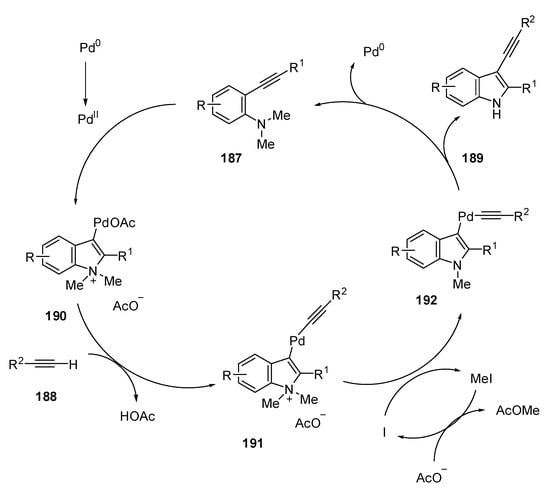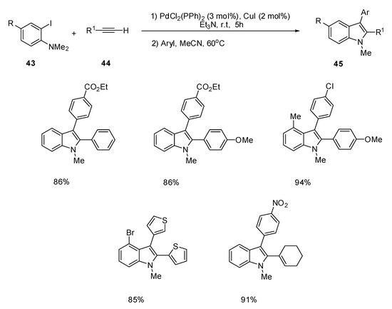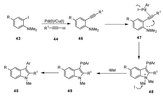 Larock and co-workers synthesized indoles (45) via a one-pot reaction by using microwave radiation and employing three components in this coupling reaction. The reaction involved two steps under Sonogashira cross-coupling standard-reaction conditions. Firstly, N-substituted/N,N-disubstituted 2-iodoaniline (43) was treated with terminal alkynes (44), followed by the addition of aryl iodide (Ar-I) and acetonitrile (CH3–CN) (Scheme 16). Mechanistic studies revealed that the first step generated N,N-dialkyl-2-(1-alkynyl)aniline (46) via Sonogashira cross-coupling. Then, the aryl iodide was added oxidatively to the Pd(0) which was transformed to an electrophilic Ar-PdI species, which later carried out the activation of the triple bond in alkyne (46) of N,N-dialkyl-2-(1-alkynyl)aniline by coordination for forming a pie-palladium complex (47). After that, it underwent intramolecular trans-aminopalladation by the 5-endo-dig cyclization, yielding the indolium species (48), which then removes a methyl group via the SN2 mechanism after the iodide anion attack in situ and yielded the indole-Pd(II) intermediate (49). Then, after reductive elimination, the 2,3-disubstituted indole derivative was acquired (Scheme 17) [160].