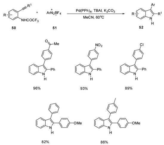 In 2010, Cacchi and co-workers synthesized novel N-H free 2,3-disubstituted indoles (52) by reacting 2-alkynyltrifluoro acetanilides (50) and arene diazonium tetrafluoroborates (51) in the presence of a Pd-catalyst (Scheme 18). The reaction followed the domino process that was started by reacting iodo-dediazoniation with TBAI to form aryl iodide in situ. The aryl iodide was added oxidatively to the Pd(0), affording a sigma-arylpalladium iodide (53) which coordinated with the carbon–carbon triple bond to form a π-alkyne-sigma-arylpalladium complex (54). This step was followed by intramolecular amino-palladation that yielded a sigma-indolylpalladium intermediate (55), which later afforded the desired N-H free indole (52) by reductive elimination and hydrolysis (Scheme 19). It was found that the reaction tolerated a variety of the substituents in arene diazonium salt as well as an alkyne, such as halo and cyano, ether, keto, –NO2, –Me, and –OMe substituents as well as other ortho substituents [161].