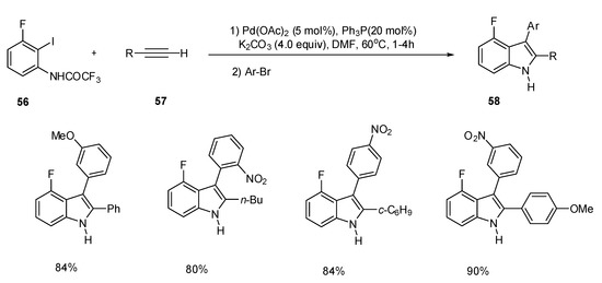 Cacchi and colleagues synthesized 3-aryl-4-fluoro-2-substituted-1H-indoles (58) regioselectively by using the 3-fluoro-2-iodotrifluoro acetanilide (56), terminal alkynes (57), and aryl bromide in a single-pot via a cascade Sonogashira-Cacchi reaction (Scheme 20). The results showed that the yields of indole formation were good when using an inorganic base, e.g., Cs2CO3 and K2CO3. However, the cyclization was better in the presence of a base such as Et3N in a microwave-irradiated process [162].
