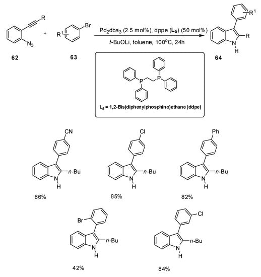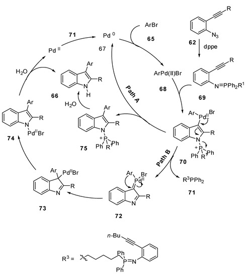 Zhou and co-workers synthesized various derivatives of 2-aryl indoles (64) by reacting aryl bromides (63) and 2-alkynyl aryl azides (62). They used dppe as a ligand with catalyst Pd2dba3 and base t-BuOLi at 100 °C using toluene as a solvent (Scheme 22). For the cyclization, the nucleophilic nitrogen was obtained in situ via the Staudinger reaction from azides [164]. The reaction proceeded via two different pathways. In the first path A, aryl bromide (65) was added oxidatively to catalyst Pd(0), affording an aryl palladium (II) species (68). The 2-alkynyl aryl azide (62) imino phosphorane (69) were generated in situ by the Staudinger reaction. Then, the intermediate (70) was obtained by 5-endo-dig cyclization. Nitrogen acted as a nucleophile and attacked the phosphinimine moiety, present in the aryl palladium (II)-activated triple bond. Later, intermediate (70) was converted to intermediate (75) by reductive elimination which, after hydrolysis, afforded the product (66). The alternative mechanism path B involved the carbene species. The Palladium (II) carbene species (72) was generated by the palladium intermediate (70) via electron’s back donation. Then, intermediate (73) was formed by subsequent migratory insertion, which afforded intermediate (74) by isomerization. The product (66) was formed after protonating the intermediate (74) and Pd(II) was reduced to Pd(0) by (71) (Scheme 23). The yield of the reaction was found to be increased by loading more dppe and Pd2dba3. The results concluded that dppe did not solely act as the ligand but also carried out other crucial roles in the transformation. The product yield was sharply reduced by decreased loading of dppe; on the other hand, the decreased loading of Pd2dba3 did not affect the yield. Furthermore, the base was found to be necessary for the reaction. The aryl bromides having meta and para substitutions afforded good yields of the required product except in the case of the p-CO2Me substituted bromide. The yield was low in the case of ortho substitution at aryl bromide. Furthermore, the reaction with the azide substrate having an aryl substituent also produced the desired product in a moderate to good yield [165].