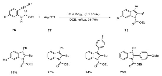 In 2016, Minami et al. used another sort of amino-palladation/reductive elimination reaction involving the palladium-catalyzed regioselective 5-endo-dig ring-closing reaction between 2-alkynyl phenyl carbamates (76) and diaryliodonium salts (77), resulting in C-arylated 2,3-disubstituted indoles (78) (Scheme 24). This reaction involved the generation of palladium (II) intermediate by the reacting diaryliodonium salts with palladium, which acted as an arylating agent by activating the C≡C. The DCE solvent was found to be the best solvent for this reaction, providing maximum yields [166].
