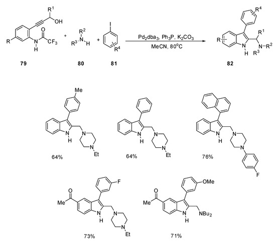 - Cacchi, S.; Fabrizi, G.; Goggiamani, A.; Iazzetti, A.; Verdiglione, R. 2-(Aminomethyl)-3-arylindoles from 3-(o-Trifluoroacetamidoaryl)-1-propargylic alcohols, aryl Halides, and amines: A domino palladium-catalyzed three-component approach. Synthesis 2017, 49, 4163–4172. [Google Scholar]