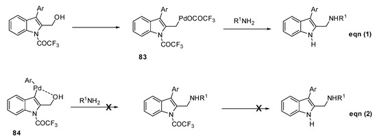 Moreover, Cacchi reported that the three-component synthesis of 2-(aminomethyl)-3-arylindoles (82) was catalyzed by palladium. The reaction was carried out between aryl iodides (81), amines (80) and 3-(ortho-trifluoro acetamide-o-aryl)-1-propargyl alcohols (79) by a simple a one-pot procedure affording two carbon-nitrogen bonds and one carbon-carbon bond (Scheme 25). The mechanistic studies suggested the formation of trifluoroacetyl ester in the reaction medium. It is also believed that palladium intermediate (83) formation is the key step in cyclization. The formation of intermediate was carried by the nucleophilic intramolecular attack of nitrogen on the activated C≡C. The activation of C≡C was performed by Pd(II) moiety generated in situ (Scheme 26, eqn (1)). Thus, this assumption rejected the formation of indole by the direct nucleophilic replacement of the -OH by amino group carried out via the palladium coordination to oxygen species (84) (Scheme 26, eqn (2)). The reaction required mild conditions and both substituted aryl iodide and propargylic alcohols at the propargylic carbon were suitable choices for this reaction. The reaction showed tolerance towards many substituents including chloro, bromo, keto, ether, ester, and cyano groups. Low yields were obtained using other phosphine ligands or Cs2CO3 as the base. The primary amines were not a suitable choice for the reaction because they involve inside reactions [167].