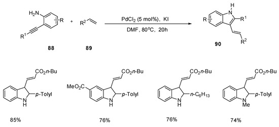 The cascade intermolecular amino-palladation reactions subsequently followed by oxidative coupling were also carried out with alkenes, contrary to the halide (X) derivatives. In 2010, Alvarez and colleagues reported that structurally diverse C3-alkenylindoles (90) were efficiently prepared by using readily available o-iodosubstituted aniline, alkynes, and functionalized olefins. In the first step, 2-alkynylanilnes (88) were formed by Sonogashira cross-coupling between o-iodo substituted aniline and alkynes, then 2-alkynylanilnes (88) underwent cascade Pd-catalyzed hetero-cyclization/oxidative Heck cross-couplings with functionalized olefins (89), affording the desired C3-alkenylindoles (90) (Scheme 28). The 5-endo-dig-cyclization of N-heteronucleophiles occurred regioselectively, and subsequent stereo selectively Heck cross-coupling took place with any mono or disubstituted alkenes, affording mostly (E) isomers. Usually, substrates bearing different alkynyl substituents e.g., alkyl (–R) and aryl (–Ar) groups, either electron-rich or electron-poor, produced the desired indole in high yields. Anilines having the trimethylsilyl (TMS) group were not affected during the reaction [169].