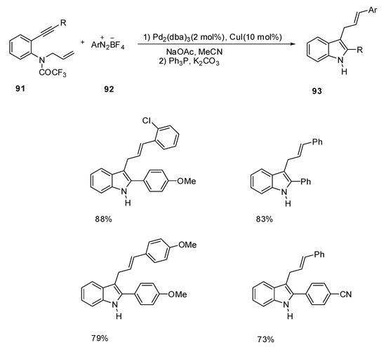 In 2011, Cacchi and co-workers synthesized 2-alkenyl indoles (93) by palladium-catalyzed reactions between arene diazonium tetrafluoroborates (92) with 2-alkynyl-N-(allyl)trifluoro acetanilides (91) (Scheme 29). The reaction involved the following series of subsequent events: (a) Heck reaction, (b) amino-palladation, and (c) reductive elimination to yield the desired product. To carry out this reaction via the single-pot procedure, K2CO3 and PPh3 were added to the crude reaction mixture obtained by the Heck reaction when MeCN was used as a solvent or after evaporating the volatile components from the crude reaction mixture when MeOH was used as a solvent and the temperature was elevated to 100 °C. The reaction mechanism is shown in (Scheme 30), which was involved the reaction of (94) with Pd(0) generating π –allylpalladium complex intermediate (96), then C≡C coordinated to Palladium and afforded (97). After that, a regioselective intermediate (98) was formed via intramolecular amino-palladation which, on subsequent reductive elimination, afforded the desired product (95) and the active Pd catalyst was regenerated after the cycle. This new methodology tolerated many useful substituents, e.g., –Cl, –Br, and –I, as well as other ortho substituents [170].