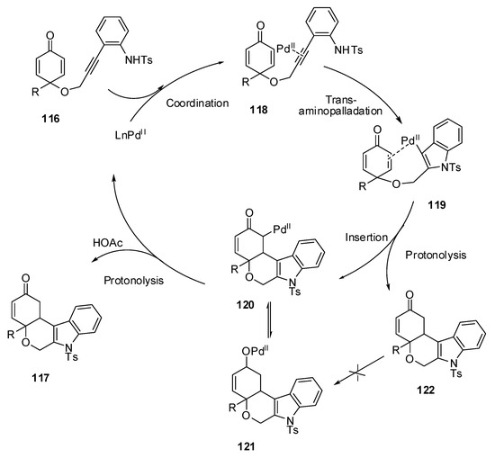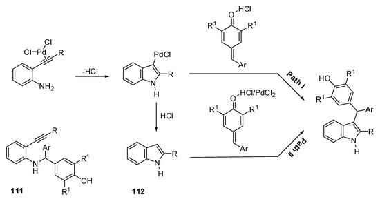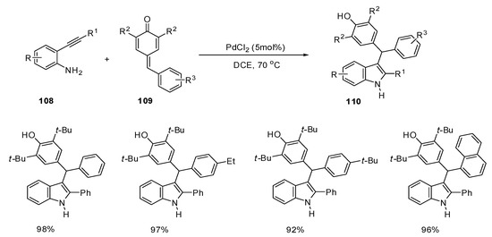 In 2015, Reddy and Vijaya Anand reported a domino process catalyzed by palladium to afford unsymmetrical diarylindolyl methane derivatives (110) by annulation of o-alkynylanilines (108) followed by subsequent 1,6-conjugated addition to p-quinone methides (109) involving mild reaction conditions (Scheme 33). For this reaction, there was no need to protect the amino group. This reaction proceeded smoothly with p-quinone methides obtained either from the electron-donating, or slightly electron-withdrawing aromatic aldehydes, producing the corresponding diarylindolyl methane yields up to 90%. The o-alkynylanilines obtained either from electron-donating or electron-withdrawing aryl alkynes afforded moderate to excellent yields of the corresponding products. During the reaction, amine addition product (111) was formed by a reversible reaction as its concentration was decreased with increased formation of the indoles (110). It was worth noting that the compound (111) was not an intermediate of this reaction. The 2-substituted indole (112) was regarded as the key intermediate, and it was formed in the rate-determining step during the cyclization process (Scheme 34) [173].