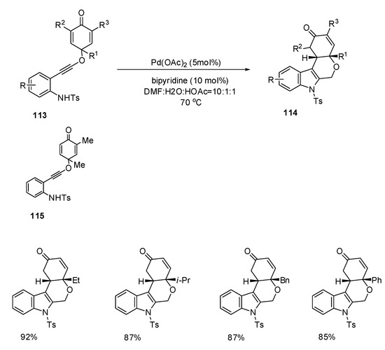 In 2013, Wang and co-workers synthesized β-indole ketones (101) by coupling 2-alkynyl anilines (99) with allylic alcohols (100) in the presence of an oxidant using palladium as a catalyst. Contrary to alkenes, allylic alcohols were used in this methodology, with inexpensive dioxygen as the oxidant (Scheme 31). These cross-couplings showed high tolerance towards many useful functional substituents and high reactivity towards electron-deficient allylic alcohols. The cyclization mainly depends on the (Pd(OAc)2 catalyst; additionally, it has a higher reactivity than other palladium catalysts. The presence of oxygen is necessary for regenerating the active Pd(II) species. Polar solvents worked best in this reaction, and studies also concluded that, in the case of DMF, high reactivity was observed in terms of both required reaction time and yield of the product. The obtained β-indole ketones can readily be used to obtain pyrrolo[2,1-a]isoquinolines and β-indole alcohol/amine, which are pharmaceutically significant [171].