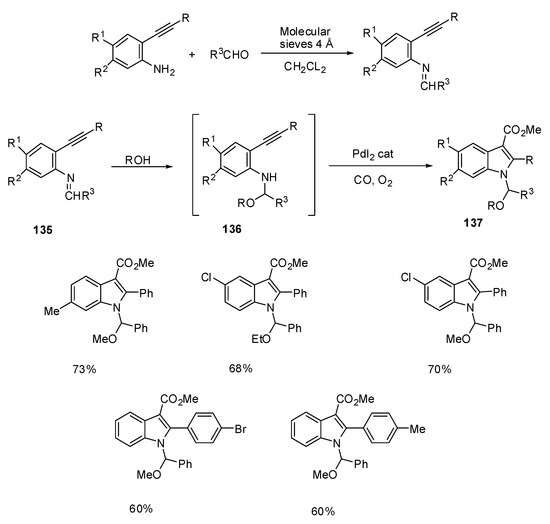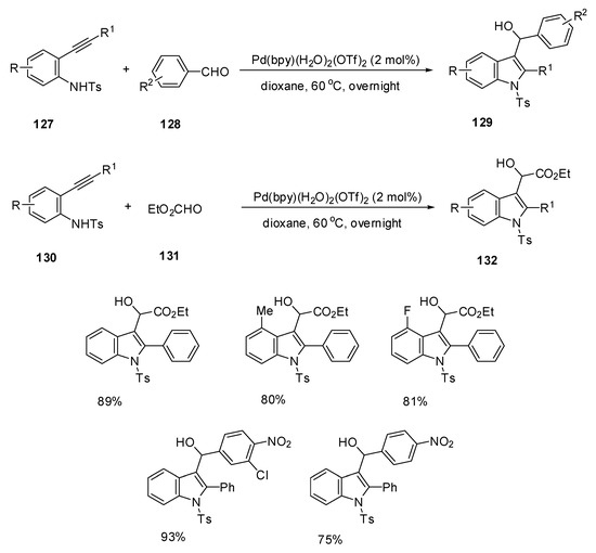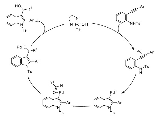 - Han, X.; Lu, X. Cationic Pd (II)-Catalyzed Tandem Reaction of 2-Arylethynylanilines and Aldehydes: An Efficient Synthesis of Substituted 3-Hydroxymethyl Indoles. Org. Lett. 2010, 12, 3336–3339. [Google Scholar] [CrossRef]