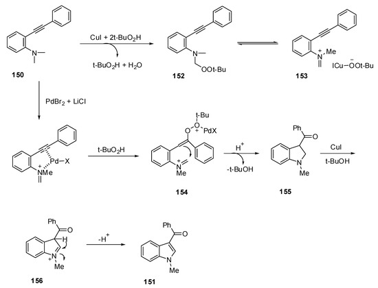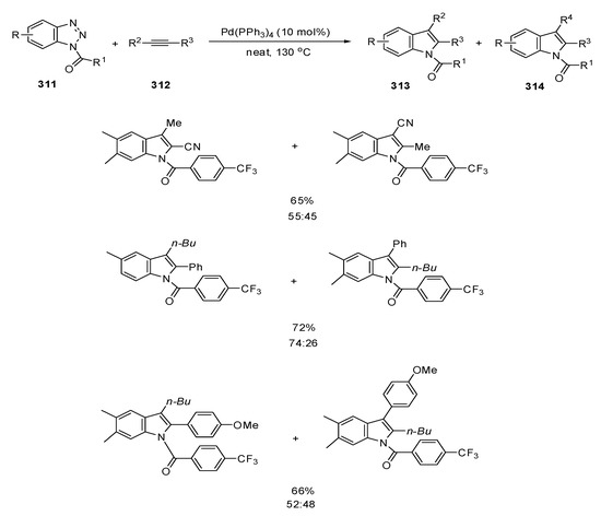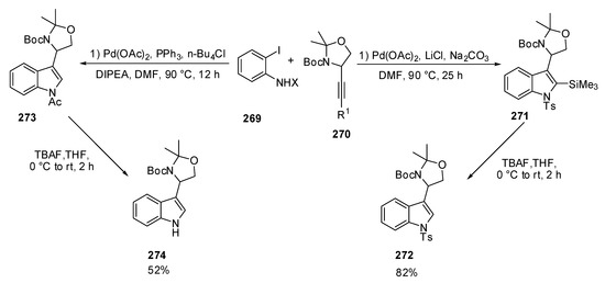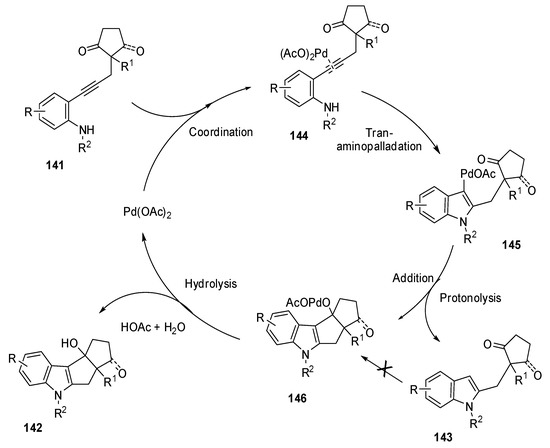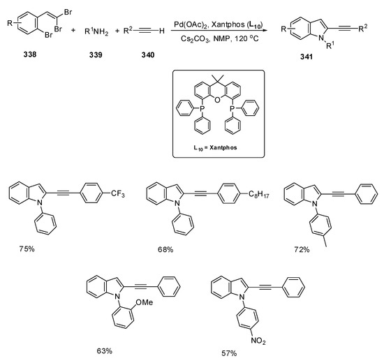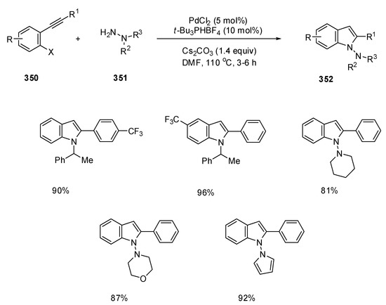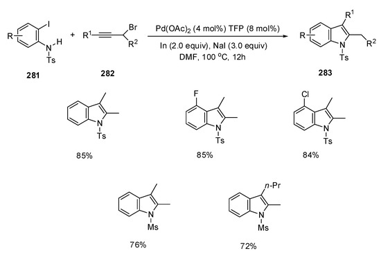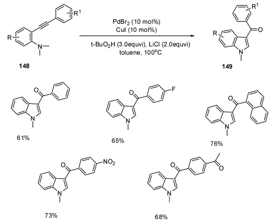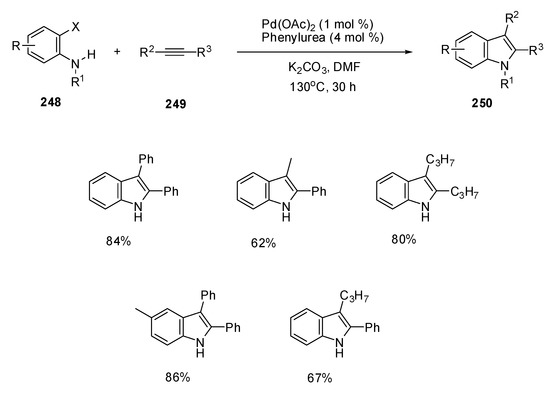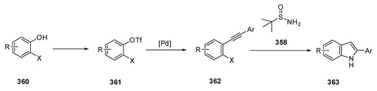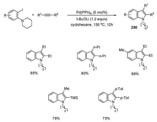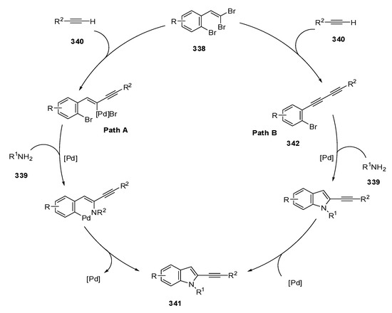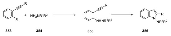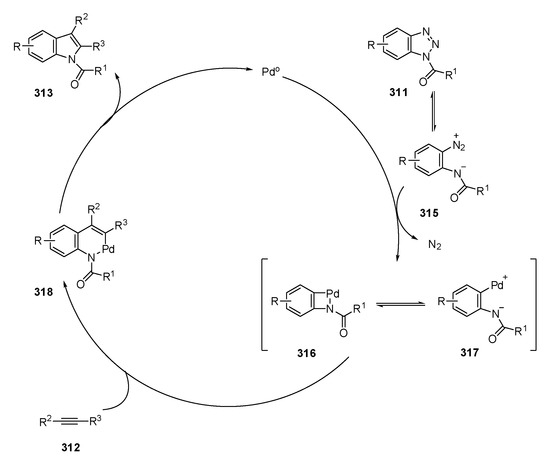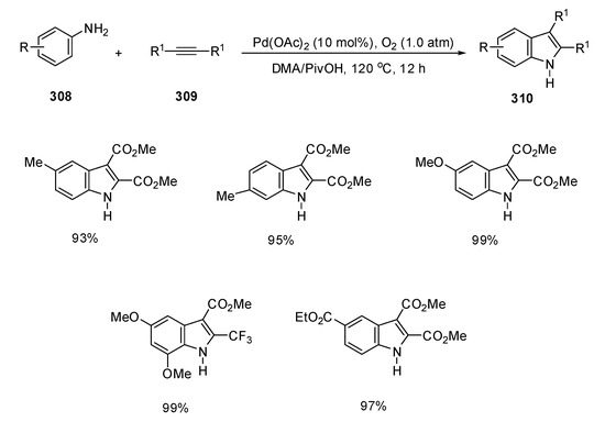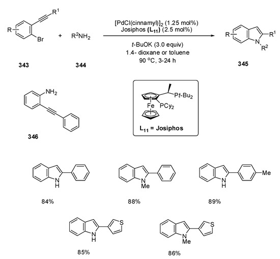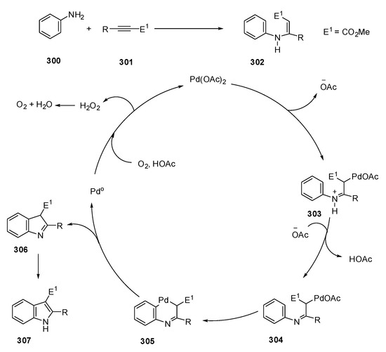 Heterocycles have recently been synthesized in modern research using various transition metals as catalysts. The Pd, Ni, Ru, and Rh are among the most commonly used metals for the synthesis of heterocycles. Metal catalysts have the advantage of constructing heterocycles from readily available starting substrates under mild reaction conditions [21]. Palladium-catalyzed coupling reactions are now regarded as a powerful tool in the synthesis of organic compounds [8,22,23,24,25,26,27,28,29,30,31,32,33,34,35,36,37,38]. About fifty years ago, C-C bond production was once considered one of the most difficult tasks, involving stoichiometric interactions between reactive nucleophiles and electrophiles or pericyclic reactions. However, using palladium-catalyzed synthesis, new gates in C–C bond and C–X bond synthesis are now being opened [39,40]. Palladium exists in three complexes with the following oxidation states: Pd(0), Pd(II), and Pd(IV). These three oxidation states can be easily interconverted, which is one of the reasons for palladium’s widespread use in organic synthesis [41]. Palladium-catalyzed couplings are favorable, as they are needed in smaller quantities, have mild reaction conditions and good yields, and are tolerant of a wide range of functional groups [42]. There are various classical methods available for the synthesis of indole and most of them are named after the scientists [25,43,44,45,46,47,48,49,50,51,52,53,54,55,56,57,58,59,60,61,62].