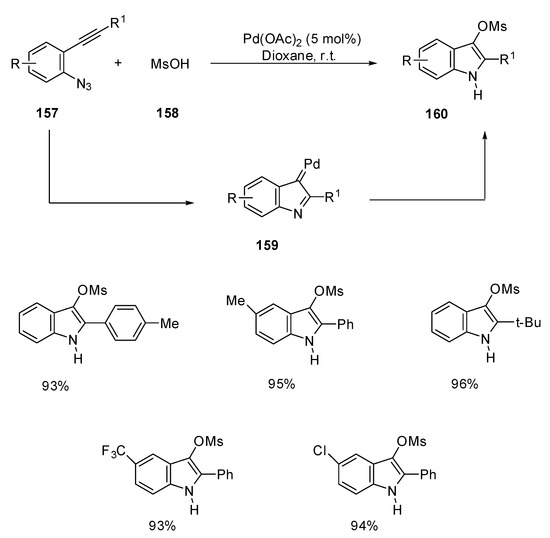 - Zhang, X.; Li, P.; Lyu, C.; Yong, W.; Li, J.; Zhu, X.; Rao, W. Synthesis of 1 H-indole-3-sulfonates via palladium-catalyzed tandem reactions of 2-alkynyl arylazides with sulfonic acids. Org. Biomol. Chem. 2017, 15, 6080–6083. [Google Scholar] [CrossRef]