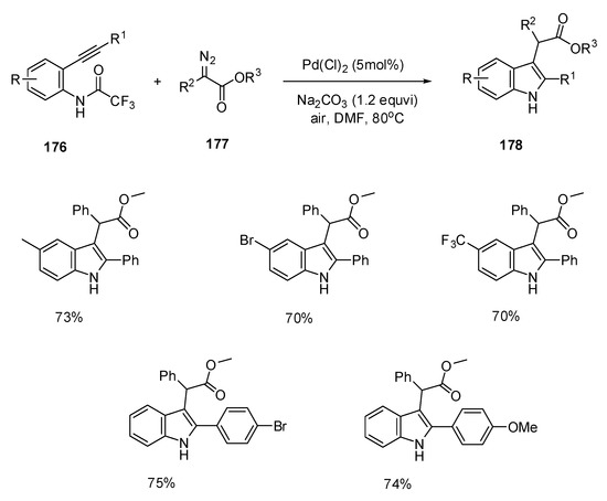 - Hu, Z.; Luo, S.; Zhu, Q. Aminopalladation-Triggered Carbene Insertion Reaction: Synthesis of 2-(1H-Indol-3-yl) acetates. Adv. Synth. Catal. 2015, 357, 1060–1064. [Google Scholar] [CrossRef]