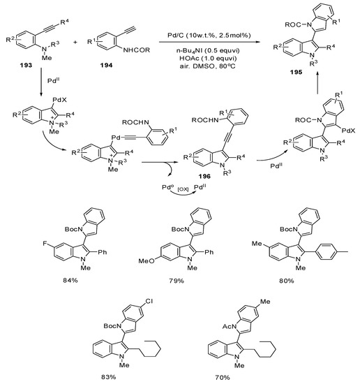 - Yao, B.; Wang, Q.; Zhu, J. Pd/C-Catalyzed Cyclizative Cross-Coupling of Two ortho-Alkynylanilines under Aerobic Conditions: Synthesis of 2, 3′-Bisindoles. Chem. Eur. J. 2015, 21, 7413–7416. [Google Scholar] [CrossRef] [PubMed]