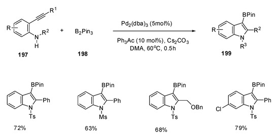 - Huang, J.; Macdonald, S.J.; Harrity, J.P. A borylative cyclisation towards indole boronic esters. Chem. Comm. 2010, 46, 8770–8772. [Google Scholar] [CrossRef]