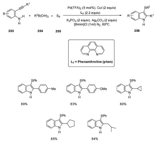 - Guo, Y.J.; Tang, R.Y.; Li, J.H.; Zhong, P.; Zhang, X.G. Palladium-Catalyzed Annulation of 2-(1-Alkynyl) benzenamines with Disulfides: Synthesis of 3-Sulfenylindoles. Adv. Synth. Catal. 2009, 351, 2615–2618. [Google Scholar] [CrossRef]