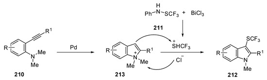 - Sheng, J.; Li, S.; Wu, J. Synthesis of 3-((trifluoromethyl) thio) indoles via a reaction of 2-alkynylaniline with trifluoromethanesulfanylamide. Chem. Comm. 2014, 50, 578–580. [Google Scholar] [CrossRef] [PubMed]