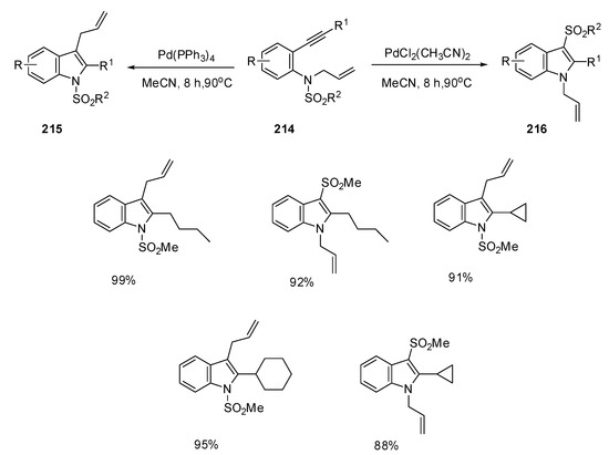 In 2013, Janreddy et al. reported a tandem reaction between 2-N-unprotected-2-alkynylanilines (102, 105) and different electron-poor alkenes (103, 106) using a Pd-catalyst and affording 2,3-disubstituted indole derivatives (104, 107). The nature of the palladium catalyst was used to affect the formation of the resulting product. The catalyst PdCl2 in MeCN at 60 °C afforded 2,3-disubstituted indole derivatives (104), while with Pd(OAc)2/LiCl or LiBr in the THF or MeCN at 60 °C, the same reaction afforded N-alkylated-2-alkynylaniline derivatives (107) (Scheme 32). The 2-(phenylethynyl)anilines having electron-donating substituents produced slightly better yields of the desired products than the substrates having electron-withdrawing substituents. Sensitive substituents, e.g., alcohol, ester, and C3H5–, were tolerable during the reaction [172].