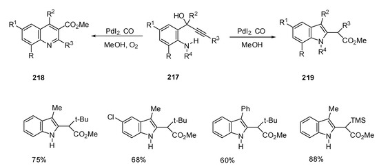 - Gabriele, B.; Mancuso, R.; Salerno, G.; Lupinacci, E.; Ruffolo, G.; Costa, M. Versatile synthesis of quinoline-3-carboxylic esters and indol-2-acetic esters by palladium-catalyzed carbonylation of 1-(2-aminoaryl)-2-yn-1-ols. J. Org. Chem. 2008, 73, 4971–4977. [Google Scholar] [CrossRef]