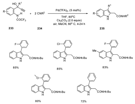 - Cacchi, S.; Fabrizi, G.; Goggiamani, A.; Molinaro, C.; Verdiglione, R. Palladium-catalyzed synthesis of 2-(aminomethyl) indoles from 3-(o-trifluoroacetamidoaryl)-1-propargylic alcohols and amines. J. Org. Chem. 2014, 79, 401–407. [Google Scholar] [CrossRef] [PubMed]