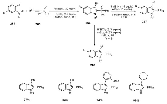 - Kondoh, A.; Yorimitsu, H.; Oshima, K. Synthesis of 2-indolylphosphines by palladium-catalyzed annulation of 1-alkynylphosphine sulfides with 2-iodoanilines. Org. Lett. 2010, 12, 1476–1479. [Google Scholar] [CrossRef]