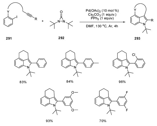 - Zhou, Q.; Zhang, Z.; Zhou, Y.; Li, S.; Zhang, Y.; Wang, J. Palladium-Catalyzed Synthesis of Indoles and Isoquinolines with in Situ Generated Phosphinimine. J. Org. Chem. 2017, 82, 48–56. [Google Scholar] [CrossRef] [PubMed]