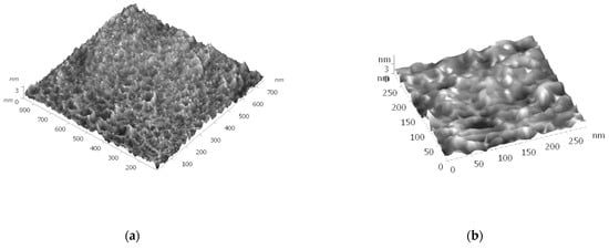 (a) AFM 3D image of structures with h~80–100 nm, formed on a modified silicon surface, based on triple complexes Ni(acac)2∙NMP∙PhOH (3.5 μm × 3.5 μm); (b) AFM 3D image of structures (30 µm × 30 µm) with h~300 nm, based on triple complexes Ni(acac)2∙NaSt∙PhOH.