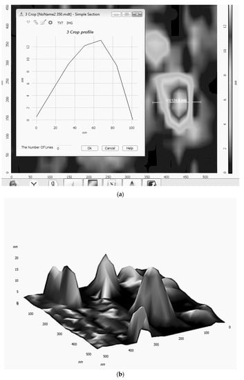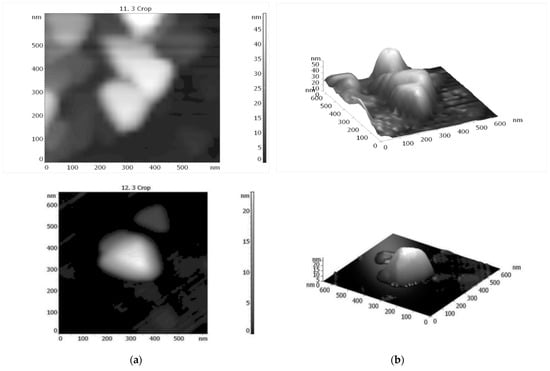 The formation of supramolecular structures due to H-bonds was also observed in the case of binary complexes {Ni(acac)2∙L2}. However, these nanoparticles differed in shape from structures based on three-component systems {Ni(acac)2∙L2 L3} and had a lower height of h~8 nm (Figure 2 and Figure 3) [].