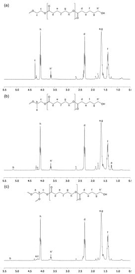 Characteristic signals corresponding to the polyester backbones of the resultant PCLs were clearly observed in the 1H NMR spectra. The signals assigned to the methylene protons were located at 1.35–1.40, 1.62–1.66, 2.28–2.31, and 4.03–4.06 ppm, whereas those due to the methylene protons adjacent to the hydroxyl end group appeared at 3.61–3.65 ppm (see Figure 1 and Figures S3–S12, Supporting Information). For PPG400-PCL, the signals attributed to PPG400 initiator appeared at 1.12 ppm (methyl protons) and 3.27–3.59 ppm (methine and methylene protons) (Figure S3, Supporting Information). For EG- and PG-PCLs, the signals corresponding to neat EG at 3.34 ppm (methylene) shifted to 4.28 ppm whereas the signals of methyl (1.16 ppm), methylene (3.40/3.62 ppm), and methine (3.91 ppm) protons of the neat PG shifted to 1.25, 4.15, and 5.13 ppm, respectively, upon polymerization (Figure 1a,b, Figures S4, S5 and S7–S10 in Supporting Information). The 1H NMR spectra of EG- and PG-PCLs also indicated the absence of non-substituted and mono-substituted EG and PG after reaction, which would be a significant difference with usual organometallic catalysts []. In case of GL-PCLs, the signals assigned to the methylene protons of the reacted GL initiator located at 4.15–4.35 ppm whereas signals of the methine protons appeared at 5.26 ppm (see Figure 1c, Figures S6 and S11, Supporting Information). When the reaction was performed in the presence of the SB initiator, signals attributed to the methyl protons of the esterified primary carbon atoms (a) were located at 4.10–4.40 ppm, while those corresponding to the methine protons of the esterified secondary carbon atoms (b,c) appeared at 4.85–5.35 ppm, indicating that both primary and secondary hydroxyl groups initiated the polymerization (see Figure S12). However, due to the relatively high activity of the primary hydroxyl compared to secondary hydroxyl of the sorbitol, a mixture of PCLs with miktoarm polymer architectures may be generated [].