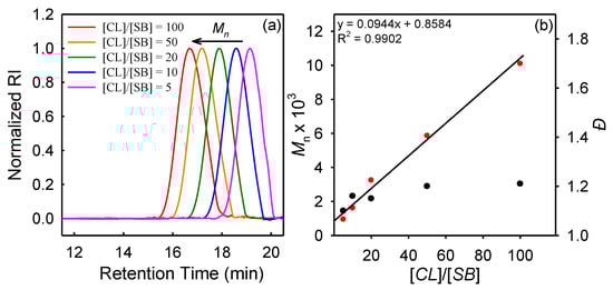 (a) GPC curves of the PCLs and (b) plot of Mn and Ð versus [CL]/[SB] obtained using various amounts of SB initiator. Conditions: DMC-EAA = 10 mg ([Zn]0 = 30 mM), [CL]0 = 9 M, Tp = 160 °C.